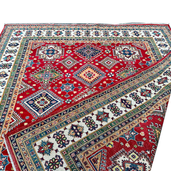 Magnífica alfombra afgana Kazak Ariana, anudada a mano, con pura lana virgen de oveja de raza Karakul, hilada también a mano, y teñida con pigmentos naturales, sobre una resistente urdimbre de algodón.